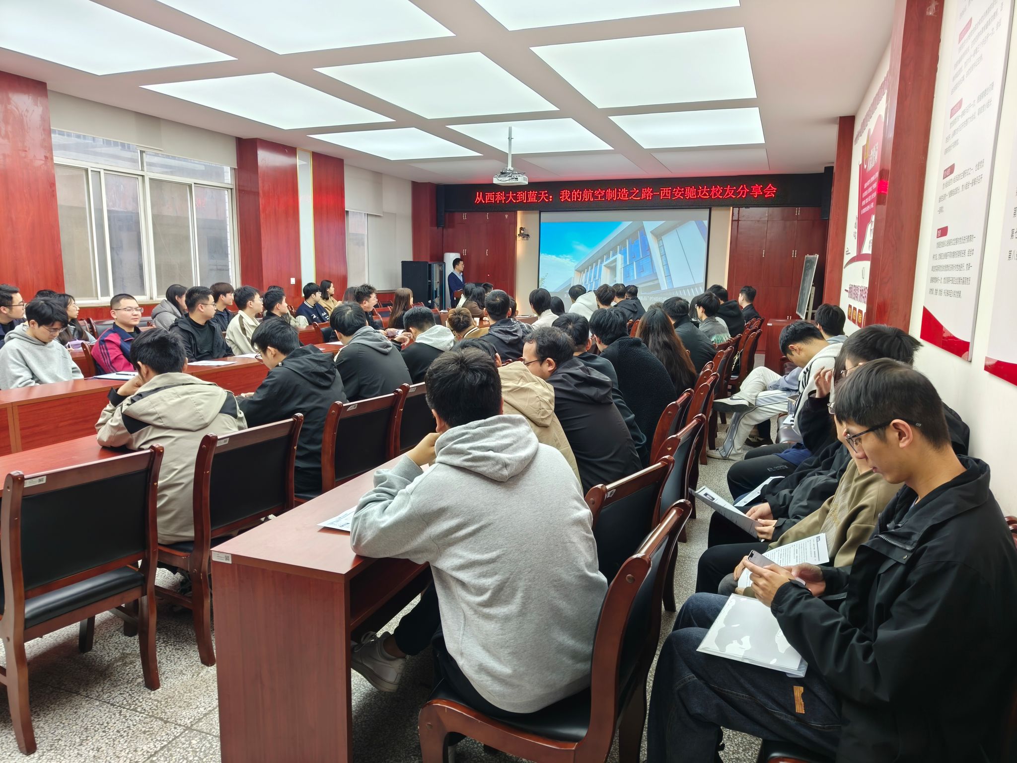 会议第一阶段,范荣军总监通过详实的信息介绍了企业发展建设历程、企业使命、发展战略、企业精神、工作信念等概况,表示期待更多西科学子加入驰达,立志航空报国,共同为航空强国建设贡献力量。王兴红专员对机械类人才需求以及培养发展做了介绍。校友分享环节,校友赵典(研发设计部设计员,2025届机械工程硕士)作为今年入职的“新鲜血液”,生动讲述了从学校到职场的过渡与挑战的心路历程,鼓励同学们坚定信心,勇往直前,其充满朝气的分享引发了众多同学的共鸣;校友高建红(生产部项目经理,2022届工商管理硕士)分享了跨专业背景下如何将所学知识与工程实践相结合,在项目中找到自身价值并快速成长的成长经历;张蒙(生产部项目经理,2021届工业设计硕士)围绕“职责的演变与能力的叠加”,分享了自己从单一的执行者,到跨职能协作者,最终成长为资源的整合者的成长路径,通过对国家战略支持、“硬科技”的价值回归、工科学子的机遇与挑战等维度阐述了其成长路径的核心是能力的持续叠加,从而不断深化个人对航空制造行业前景的理解,同时强调了在校期间打牢专业基础、培养系统思维的重要性。