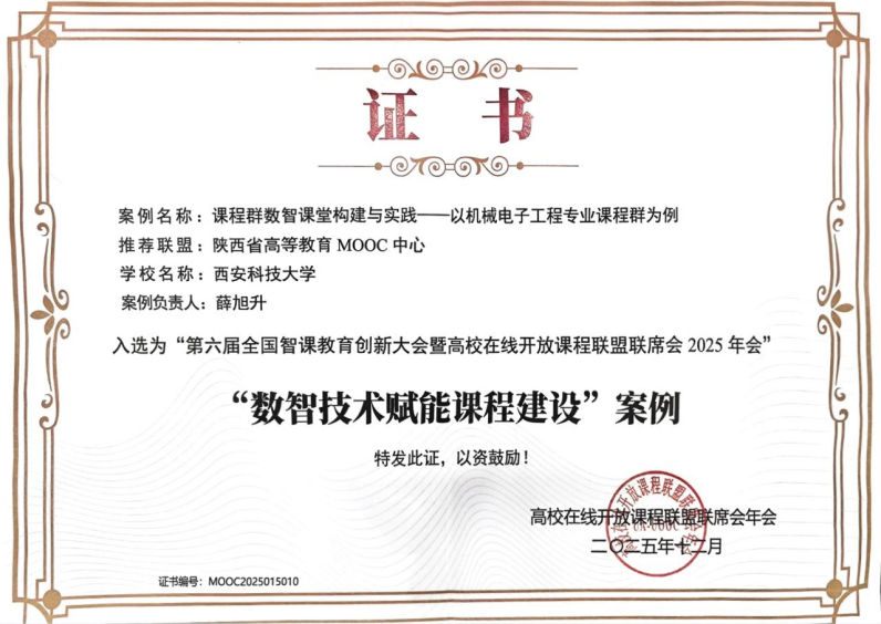 近日,从高校在线开放课程联盟联席会获悉,m88.com申报的“课程群数智课堂构建与实践——以机械电子工程专业课程群为例”教学成果(案例负责人薛旭升副教授),经严格遴选入选“第六届全国智课教育创新大会暨高校在线开放课程联盟联席会2025年会”数智技术赋能课程建设优秀案例。